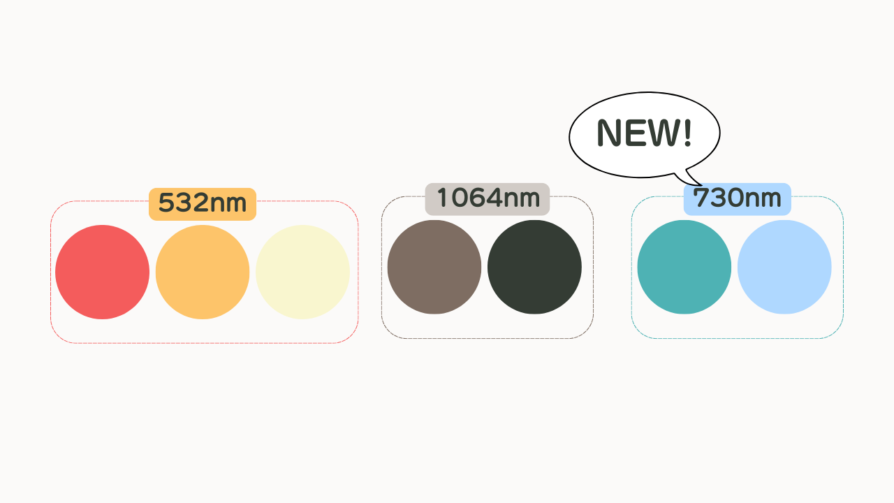 ピコウェイは532nm、1064nmに加え、青と緑の色素に適応する730nmの波長が加わりました。黒・茶・赤・オレンジ・黄に加え色素の破壊が難しいとされていた青・緑を含む全ての色調に対して高い効果が期待できます。 そして色素に火傷させることなく安全に破壊、除去することが可能です。