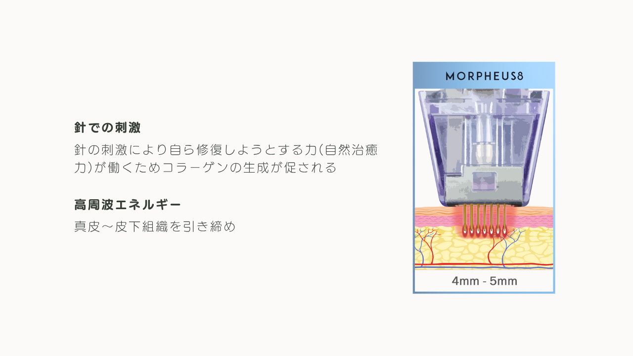 また、モフィウス8は針の長さが最大4㎜まであるため、従来のマイクロニードルRFよりも深い層(脂肪層)まで針を刺入することができます。そのためため瘢痕治療なども期待できますがたるみ改善や引き締めに効果的です。