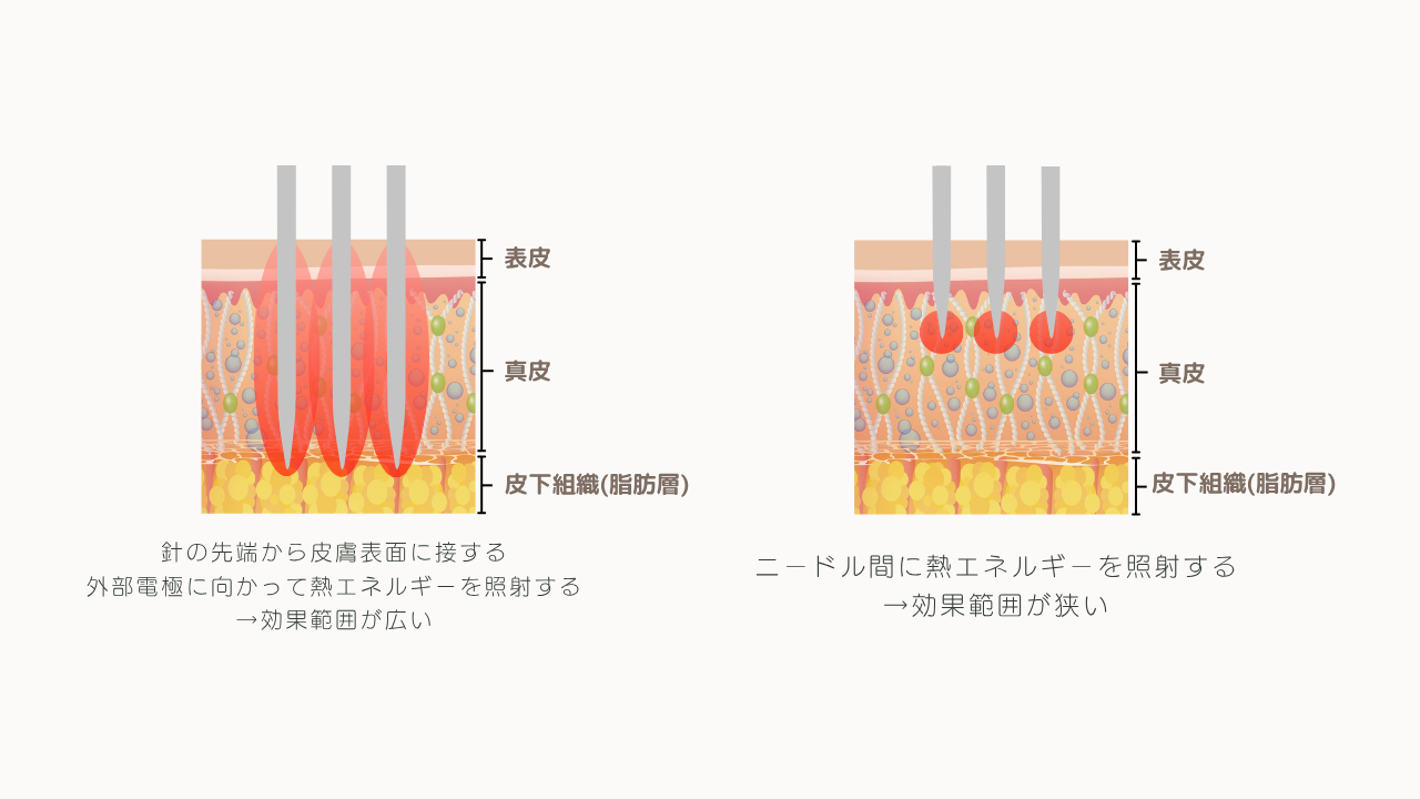 従来のニードルRF熱の入れ方はニードル間でエネルギー照射するもの、対極板に向かってエネルギー照射するものがあり、針の深さや熱の入れ方を細かく設定でき、皮脂分泌抑制や毛穴改善に効果的です。