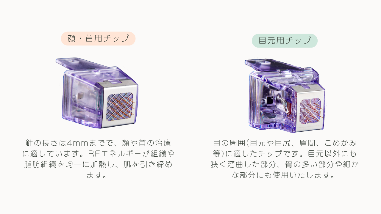 さつびでは施術部位に応じて「顔用」「目元用」の2種類のチップを導入しています。