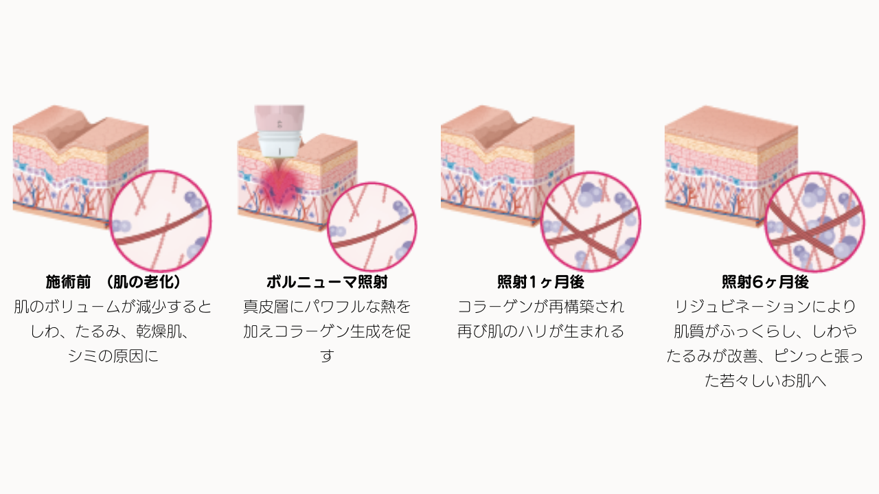 ボルニューマは電極が1個のモノポーラ式の高周波機器で皮膚のタイトニングに有力な6.78MHzという周波数を採用しています。真皮層や脂肪層などの深い部分に均一な熱エネルギーを与えることにより、コラーゲンの生成や再構築が起こり、肌のたるみやシワを改善します。また脂肪層の緩みを引き締める効果もあります。このような効果は施術直後から3~6ヶ月後まで持続します。