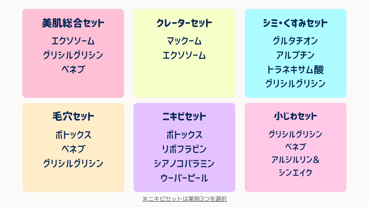 薬剤がたくさんあって分からない...自分の悩みに特化したプランで治療していきたいなどお客様のお声にお応えして、それぞれのお悩み特化した薬剤セットプランが登場!他にも15種類以上の薬剤を取り揃えているので個々のお悩みに合わせて薬剤のカスタム化も可能です!