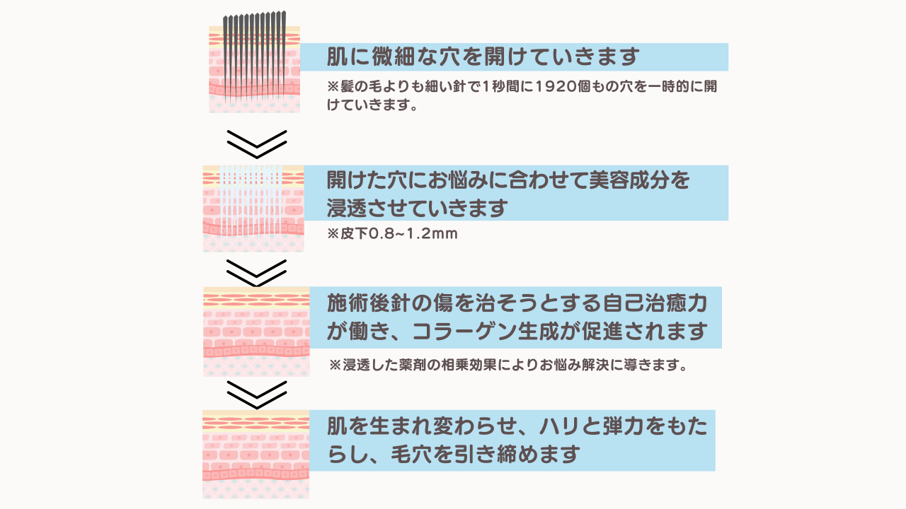 ダーマペン4では、1秒間に1920個もの微細な穴をお肌に開けることで、傷を治そうとする自然治癒力を引き出します。このプロセスでお肌はコラーゲンやエラスチンを新たに生成します。ハリのあるぷるぷる肌へと導き、シワや毛穴の開き、ニキビ跡(クレーター、色素沈着)にも効果が期待できます。また、微細な穴にお悩みに合わせた美容成分を浸透させることで相乗効果が期待できます。